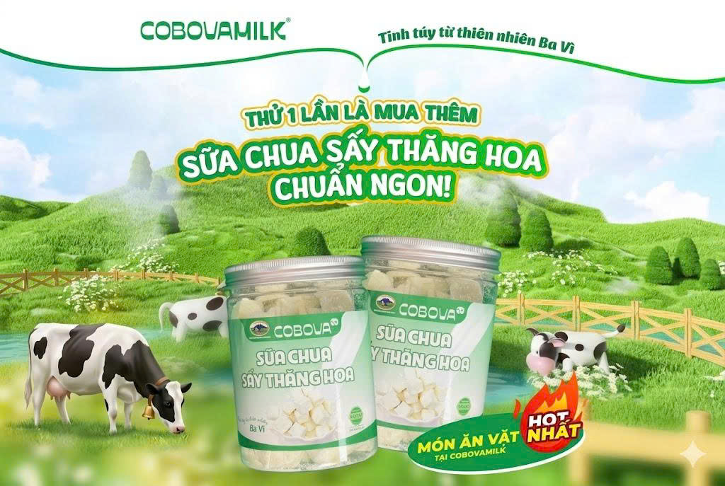 Trong hành trình phát triển đó, Sữa chua sấy thăng hoa COBOVAMILK ra đời như một dấu ấn đặc biệt, kết hợp giữa nguồn sữa tươi chất lượng cao của Ba Vì và công nghệ chế biến hiện đại. Sản phẩm không chỉ mang hương vị thơm ngon đặc trưng của sữa chua truyền thống mà còn thể hiện khát vọng đưa đặc sản vùng sữa Ba Vì đến gần hơn với người tiêu dùng trên khắp mọi miền.